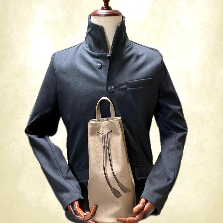 ワンショルダータイプの巾着バッグです。外装はエトープのソフトで上品なシュリンクレザー、内側はダークブラウンのスムースレザーを使用しています。